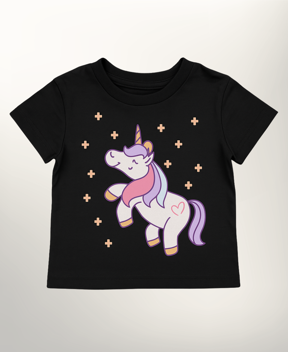 Adorable unicorn kids’ t-shirt with a playful pastel design on black fabric.